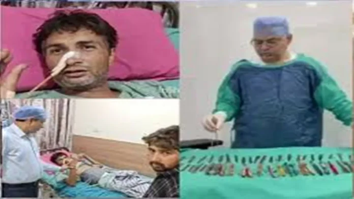 हापुड़। हापुड़ के एक निजी अस्पताल के डॉक्टरों ने नशे की लत का इलाज करा रहे एक व्यक्ति के पेट से दो पेन, 19 टूथब्रश और 29 स्टील के चम्मच निकाले हैं, जिससे उसकी जान बच गई। एक अस्पताल ने यह जानकारी दी। देवनंदनी अस्पताल के डॉक्टरों का कहना है कि बुलंदशहर निवासी और वहां एक नशा मुक्ति केंद्र में भर्ती सचिन नामक मरीज को पेट में तेज दर्द की शिकायत पर इस अस्पताल में लाया गया था।