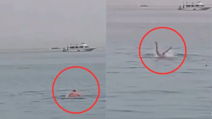 वीडियो में देखा जा सकता है कि एक शार्क मछली समुद्र में तैर रहे शख्स के पीछे पड़ी हुई है। शख्स उस शार्क मछली से बचने की जद्दोजहद कर रहा है। वह तेजी से तैरकर भागा हुआ दिख रहा है, लेकिन शार्क मछली के आगे उसकी एक नहीं चल पाती और आखिरकार मछली उस आदमी को अपना शिकार बना ही लेती है। वीडियो में आप देख सकते हैं कि शार्क मछली उस शख्स को जिंदा चबा जाती है। शख्स खुद को बचाने की बहुत कोशिश करता है लेकिन वह असफल रहता है और शार्क मछली का शिकार बन जाता है। वीडियो में यह भी दिख रहा है कि शार्क पानी में शख्स के शरीर के हिस्सों को चबाती रही, फिर भी वह खुद को बचाने के लिए तैरता रहा, लेकिन आखिरकार वह शार्क के आगे कब तक टिक पाता। इस भयावह घटना को पास में ही स्थित नाव पर सवार लोगों ने अपने कैमरे में कैप्चर किया है।