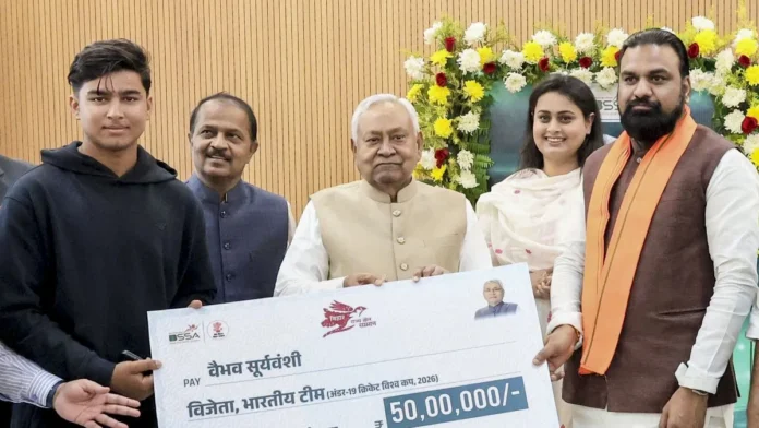 नितीश कुमार ने सोशल मीडिया प्लेटफार्म X पर ट्वीट करते हुए लिखा कि पटना स्थित 1 अणे मार्ग के ‘संकल्प सभागार’ में अंडर-19 क्रिकेट वर्ल्ड कप-2026 की विजेता भारतीय टीम में उत्कृष्ट प्रदर्शन कर बिहार को गौरवान्वित करने वाले वैभव सूर्यवंशी जी को 50 लाख रूपए का चेक एवं अंगवस्त्र प्रदान कर सम्मानित किया। अंडर-19 वर्ल्ड कप-2026 की भारत की जीत में बिहार के क्रिकेटर श्री वैभव सूर्यवंशी ने अपनी महत्वूपर्ण भूमिका निभाई। वे अपनी मेहनत और प्रतिभा के बल पर भारतीय क्रिकेट की एक नई उम्मीद बने हैं। मेरी शुभकामना है कि श्री वैभव सूर्यवंशी भविष्य में भारतीय टीम के लिए नया कीर्तिमान रचें और देश का नाम रौशन करें।